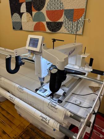 Handiquilter Avante 18 longarm on a loft frame. Originally purchased from Notion to Quilt in 2008. Accessories included: light bar; acrylic ruler base attachment; additional bobbins, needles and quilting pins. No computerized element, only free motion. Has been professionally serviced within the last year, great starter machine!