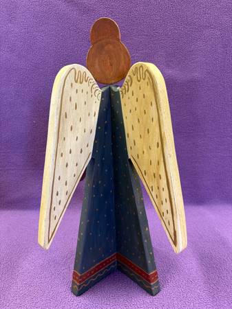 Hand crafted and hand painted wooden angel. Comes apart to store flat. 14 1/2” tall