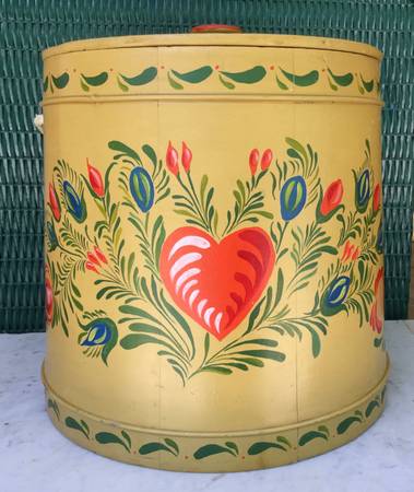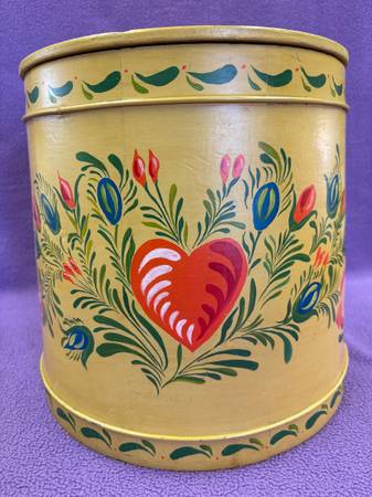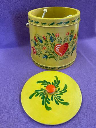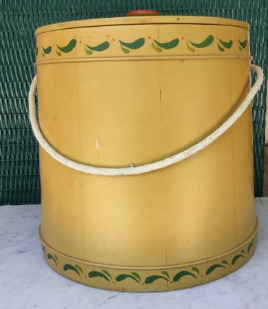 Vintage hand tole painted wooden bucket with lid and rope handle. 10” talk 9” top width 10” bottom width