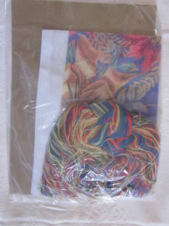 New, unopened cross-stitch and needlepoint kits come complete with Aida cloth, cotton floss, graph, needle and instructions. -Roses and Birds Bell Pull $10.00 -Poinsettias and Bows Needlepoint Kit...
