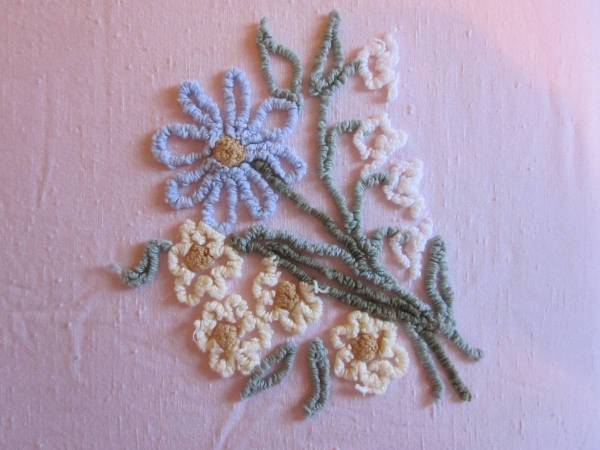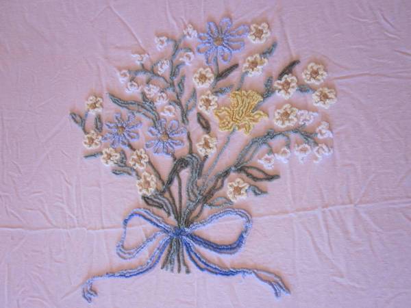 VINTAGE BEDSPREAD for arts and crafts projects or use as a bedspread. Pink with needlework flowers. Twin/ful size at 92"L x 94"W Remake as pillow covers, bags, mini-quilt, or dimensional floral in...