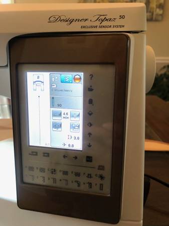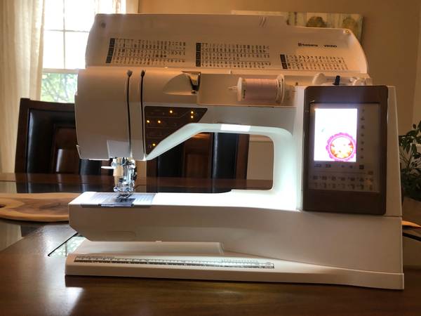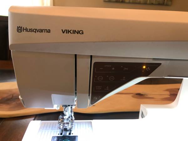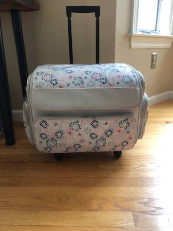 Beautiful, gently used Husqvarna Viking Designer Topaz 40 sewing and embroidery machine — in great condition! Comes with a rolling floral-patterned tote for easy storage and transport.