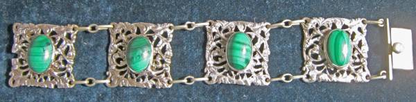 A Vintage .800 Silver and Malachite Bracelet with Elaborate Open Fretwork and Hinged Sections, 7 1/2 in. x 1 3/8 in. LIST PRICE: $135