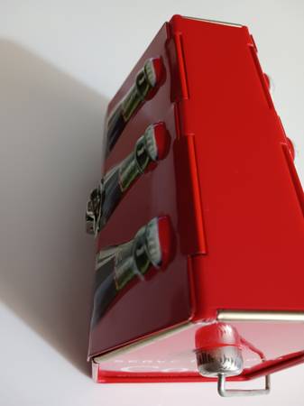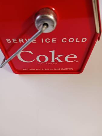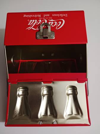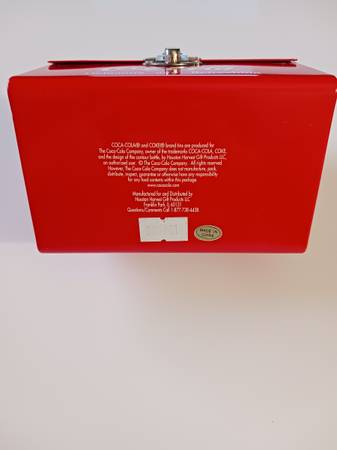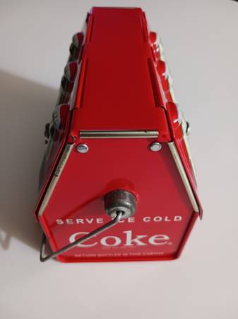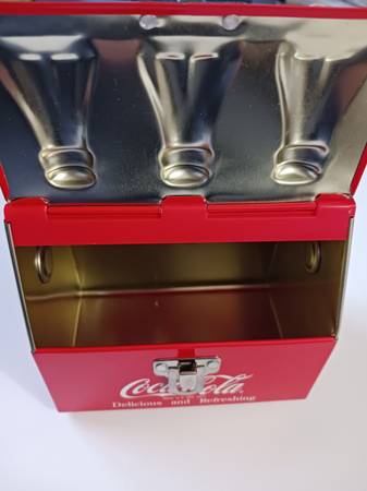 For sale is a vintage Coca Cola small metal tin box. The tin measures approximately 4.25 inches tall by 4.75 inches across by 3 inches deep. It has a handle, and opens on both sides with a metal...
