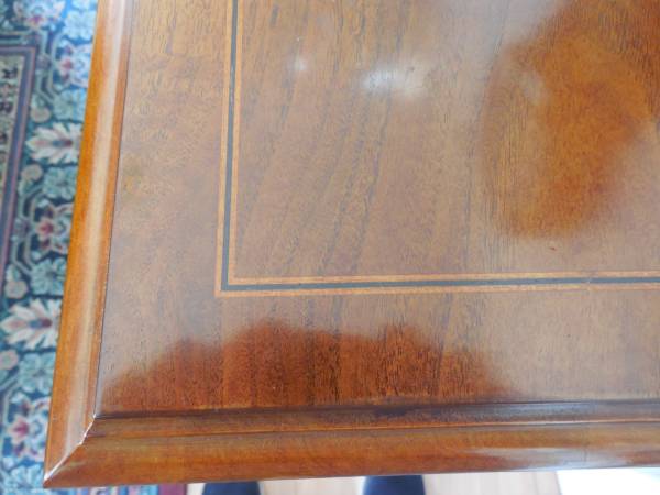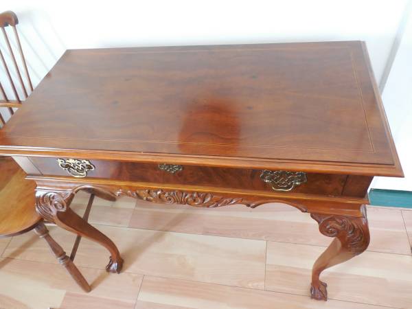Fancher book matched hall table with inlaid boxwood and one drawer, batwing hardware and metal pulls, cabriole style legs with ball and claw feet. This is custom hall table made by world famous Fancher Chair Co. of NY. A great piece in excellent condition. Measures 36" long x 18.5" wide x 32" tall. This a quality piece of furniture from an estate in Tuxedo Park in NY. I don't know its age or history, but it has been well cared for. PRICE REDUCED