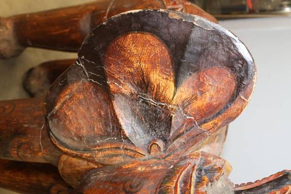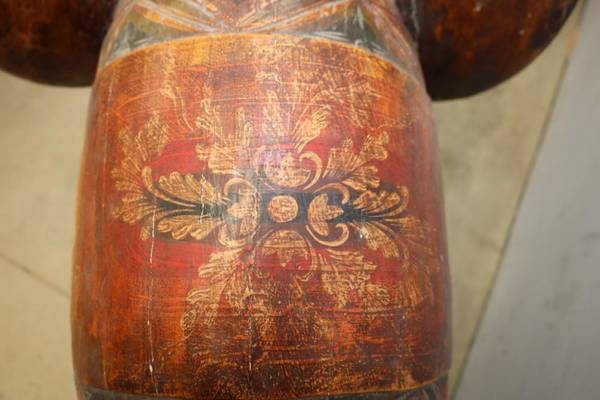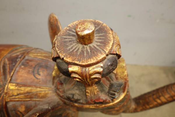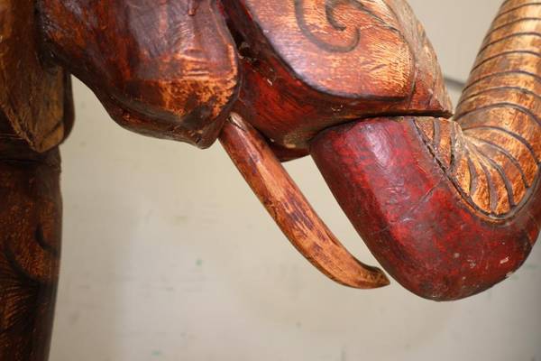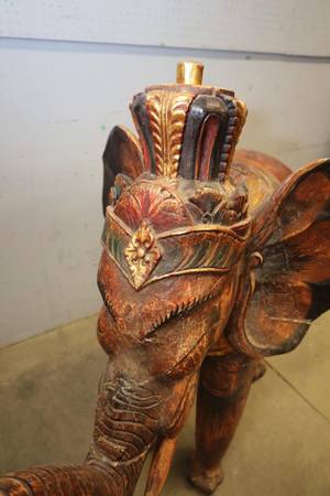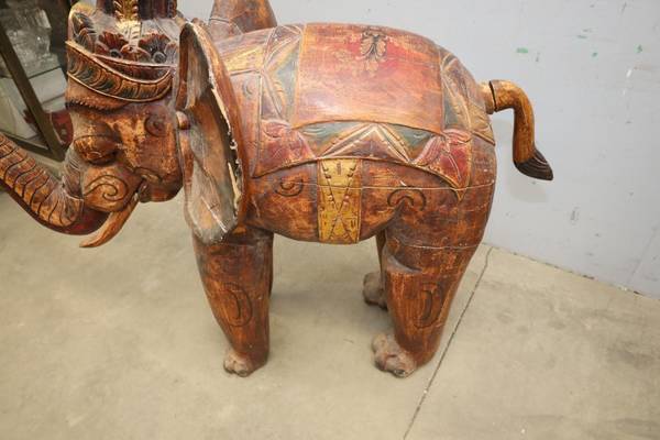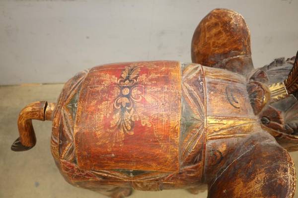 Vintage/ antique carved wooden elephant hand painted with yellow, green, red, and brown colors. Comes with removable trunk and tail. One tusk missing. Has a solid wooden body with no discernable makers mark, likely carved in India. Dimensions consist of 46"tall X 64" long X 25" wide. Selling for $295