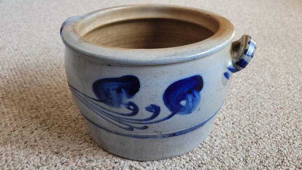 STONEWARE CROCK WITH BEAUTIFUL COBALT BLUE DECORATION. Approximately 8.5 inches in diameter by 6 inches tall. Nice Condition.