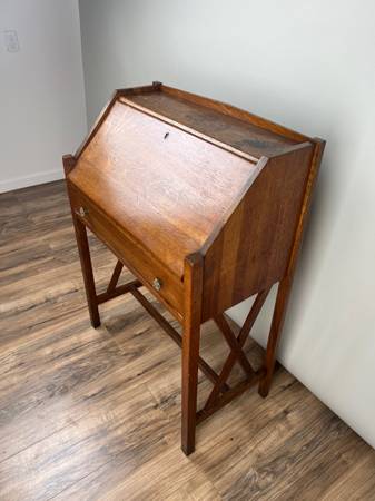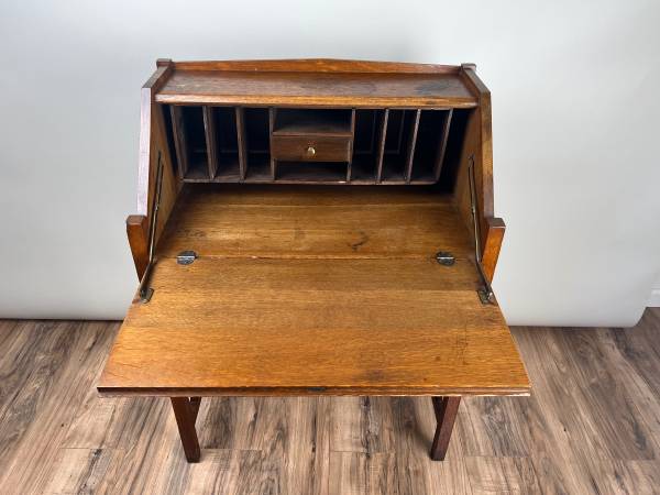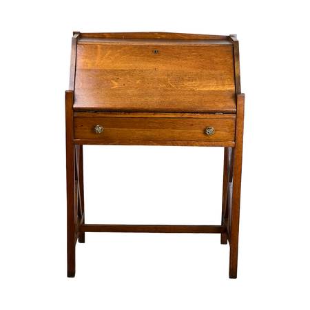 The desk features a single drawer with two mismatched but period-appropriate pulls, and a drop-down writing surface that opens to reveal a writing compartment inside. The original oak shows attractive grain and a warm patina throughout, and the desk’s slender proportions make it an excellent choice for smaller spaces like entryways, bedrooms, or reading nooks. Side stretchers and lattice details reinforce its structural integrity and visual charm.