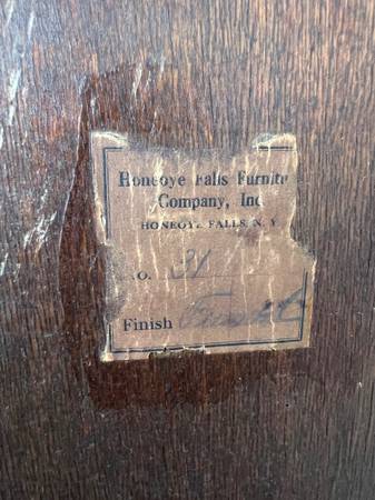 In nice antique condition consistent with age and normal use. There is some staining on the top gallery, likely from a plant, as well as minor surface marks and light wear to the wood finish. A charming and practical piece with local New York roots and timeless appeal. 40h x 28w x 16d