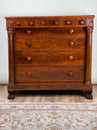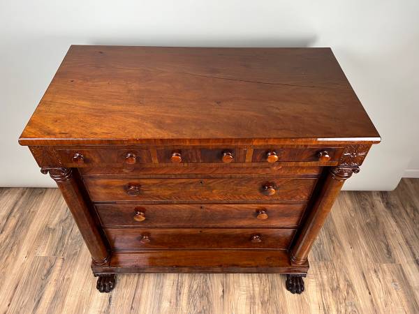 This impressive Late Federal period chest of drawers dates to around 1840 and is crafted from richly figured mahogany with a stately presence. The top drawer arrangement features a band of five small drawers across the top—typical of the era—adding both visual interest and functional storage. The piece is flanked by full turned columns that terminate in bold carved paw feet, giving the chest a sense of strength and classical gravitas.