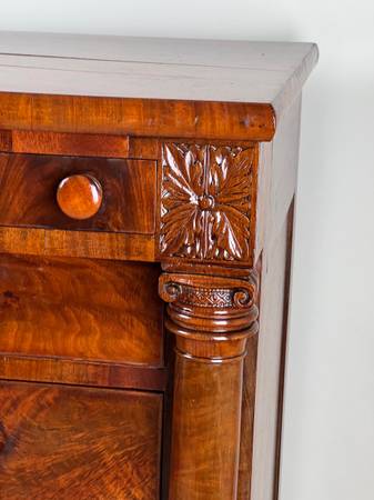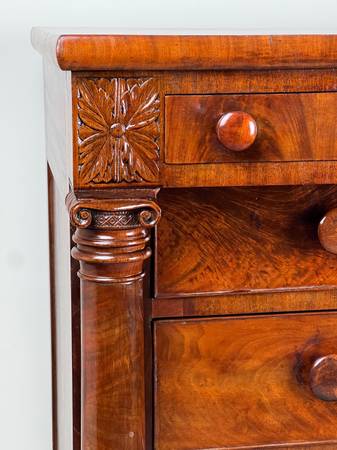 The selection of solid mahogany and mahogany veneers showcases a beautiful flame grain pattern throughout the drawer fronts and case. Hand-cut dovetails and wooden drawer pulls reinforce the fine craftsmanship of the period. The carved leaf accents on the corners above the columns are particularly well done and lend the piece a more refined architectural presence. The proportions and overall construction suggest a likely Mid-Atlantic or Northeastern origin.