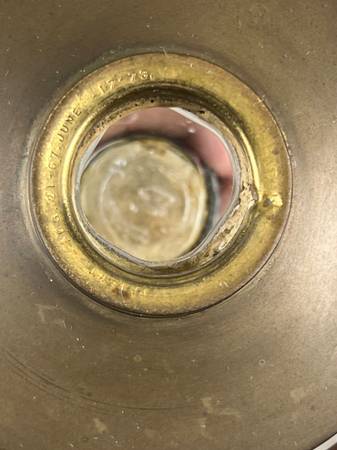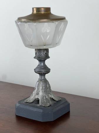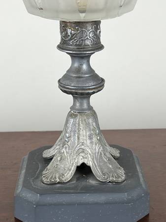 This lamp is a fine example of period craftsmanship, when decorative lighting blended art and utility. The spelter body retains much of its original finish, offering a pleasing contrast against the etched glass shade and brass collar. Together, these materials lend a sense of quiet sophistication to the piece, suitable for display in both traditional and eclectic interiors.