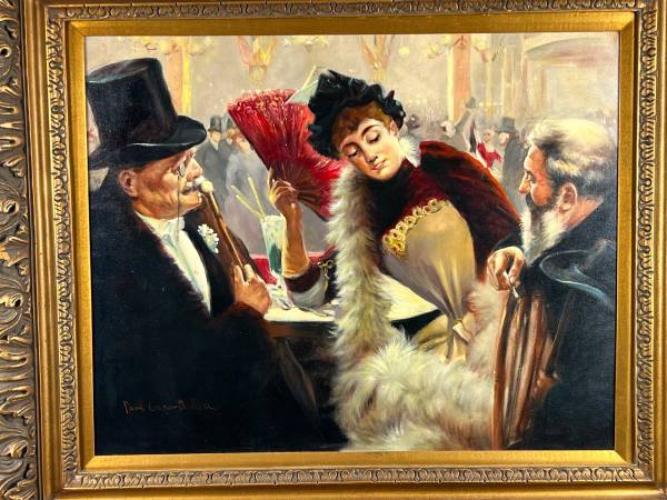 Though spuriously signed at the lower left, this later interpretation skillfully captures Helleu’s fluid brushwork and sense of intimacy, with a composition that balances charm, wit, and a touch of intrigue. The palette of rich reds, creams, and golds evokes the glamour and indulgence of late 19th-century Parisian café culture, a favorite subject of artists like Helleu, Boldini, and Toulouse-Lautrec.