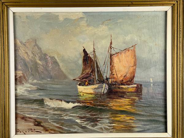 Rendered with confident brushwork and subtle layering, this work reflects the traditional European school of marine painting that flourished in the late 19th and early 20th centuries. The artist pays particular attention to the play of light on water and canvas sails, creating both movement and mood in equal measure. The cliffs in the distance add depth to the composition and balance the strong diagonal formed by the shoreline and boats.