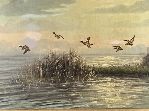 A tranquil oil on canvas landscape titled “Mallards Over Marsh” by listed American artist Joseph Glotzer (1925–2007). Glotzer was an accomplished painter known for his luminous landscapes and coastal scenes, with works appearing at auction through Skinner, Inc. and included in the MutualArt database. This evocative mid-20th-century painting captures a flock of mallard ducks in graceful flight over a quiet marshland at sunset.