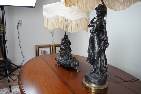 This vintage pair of Art Nouveau figural lamps, dating to around 1920, reflects the elegance and romantic style of the period. Crafted of cast metal with a bronze finish, each lamp features a finely modeled figure — one seated beside a lyre, the other standing and holding a mandolin. Their expressive forms and flowing drapery are characteristic of the Art Nouveau movement, making them striking decorative pieces.