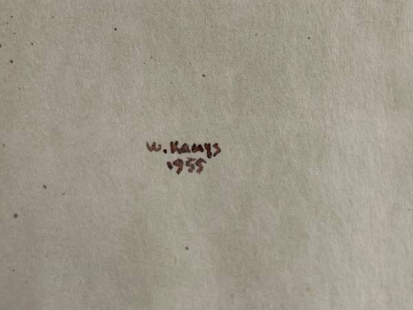 This evocative ink on paper work titled “Assisi” was created in 1955 by Walter Kamys, capturing the historic Italian hill town through a distinctly modernist lens. Rather than a literal architectural rendering, Kamys abstracts the clustered forms of Assisi into a rhythmic composition of lines, planes, and tonal washes. The hillside village emerges organically, with structures stacking and interlocking in a way that conveys both density and elevation while maintaining a sense of lightness and movement.