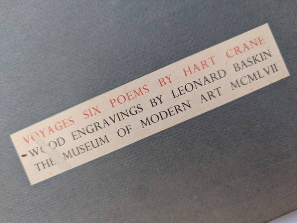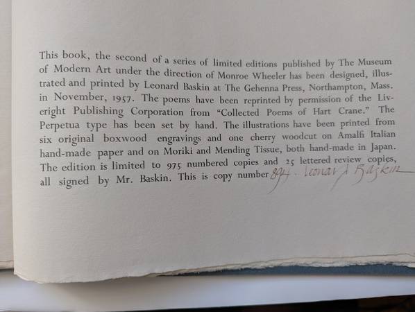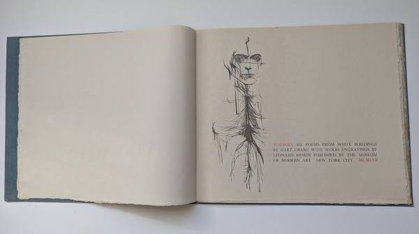 DESCRIPTION: Poems by Hart Crane, 7 wood engravings by Leonard Baskin. Second in a series of limited editions published by MOMA, under the direction of Monroe Wheeler, this book was designed, illustrated and printed by Baskin at The Ghenna Press, Northampton, MA. limited to 975 numbered copies and 25 lettered review copies, all signed by Baskin.