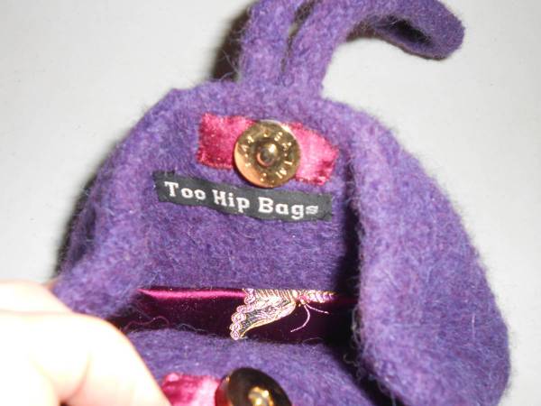 For sale is a beautiful Too Hip Bags brand small purple wool felt bag with a design that has beads and a flower design on the front of it. This would be a great bag to use with jeans or a dress. The...