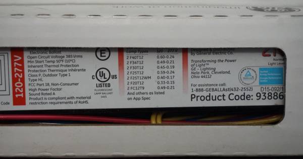 Details: GE Multi-Volt Ultra Start T12 Electronic Ballast; Wide Range 120 to 277V; Min start temp = 50F; Use with various bulb types ranging from (2) F40T12 to (2) FC12T9