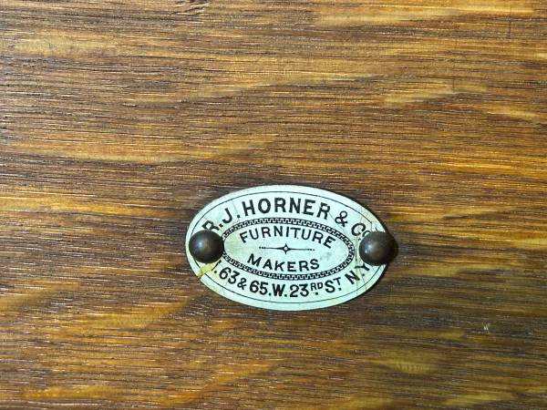 R. J. Horner mirror in carved quarter-sawn oak. Exquisite details. Wonderfully preserved, with expected vintage wear Can be mounted to a vanity, or hung as a wall, entry or hallway piece