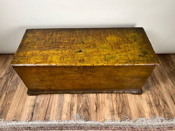 A charming 18th century New England six-board pine blanket box retaining its original or very early mustard grain-painted surface. The case is constructed in the classic form with overhanging lid, applied base molding, and interior till, exemplifying the practical joinery and straightforward rural design of the period. The untouched paint surface has mellowed beautifully over time, developing the warm ochre tones and soft abrasions that collectors look for in early American painted furniture.