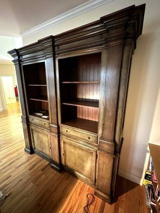 Furniture: Diminutive Asian console/cabinet with 3 drawers - handsome, attractive Italian dining room server, Boston rocker, French Empire style side tables, MCM enameled metal bar cart, 5 piece vintage Brown and Jordan iron dining set (4 arms, rectangular table), currule foot stool with needlepoint, rattan magazine rack, diminutive Victorian lady’s desk, leather Queen Anne style wing chair, king size bed with upholstered headboard, substantial 2 part bookcase with drawers and blind door storage – attractive and functional, MCM walnut dining room hutch with bass mounts, 2 French style upholstered armchairs.