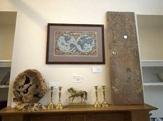 Art Work: Chet Kalm, Warren Vienneau, Rick Murray, Japanese scroll, striking collage of George Washington, vintage Chagall poster, pair of 19th c beautifully framed French prints, scarce Air France map by Lucien Boucher – beautifully framed by Ann Getsinger – 1952.