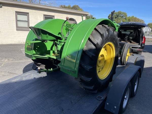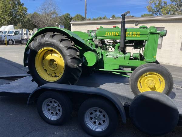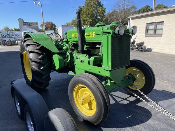 This is a very nice John Deere A Orchard model. It is the un-styled variant. I was using the tractor up until about 5 year ago when I got interested in a different hobby and moved on. I'm thinning my tractor collection. This unit is very nice. The tires are 100% but the sidewalls have some cracks. The paint has no scratches or other issues. Always stored indoors.