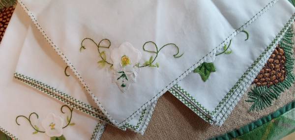 Clean and nice, new-like hand embroidered edges, chain stitched tendrils and hand sewn appliqué flowers and leaves make these napkins special.