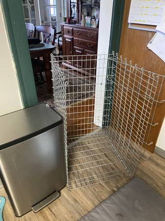 Our new puppy can finally roam freely in house. This crate is heavy duty steel rods and plated. Silver color. Has plastic bottom tray. Easy to assemble and break down for travel. Just takes a few moments to reassemble (once you figure it out.) Has 4 corner-rods that simply pull up and out; and crate is ready to store or move. $30. Thanks. Measurements available if interested.