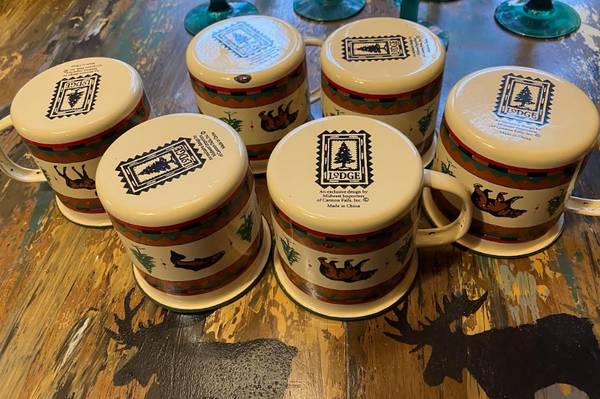 LOT OF 6 MIDWEST LODGE enamelware mugs does have a chip on one as shown. Other than that, perfect. $25 for all.